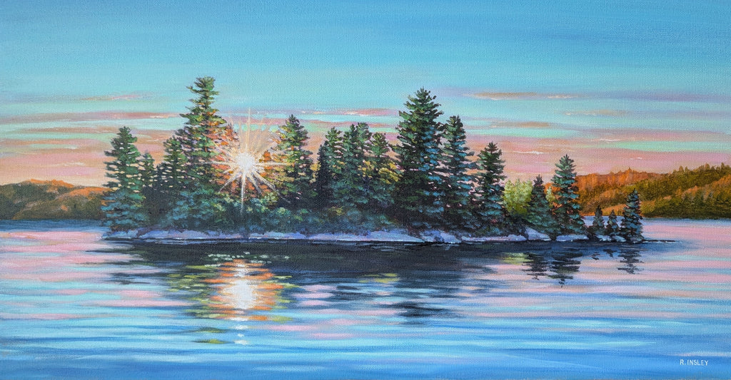 The sun rises over an island of evergreens, painting the sky in shades of pink and aqua. Peeking through thr trees, the light casts a shimmering reflection on the water