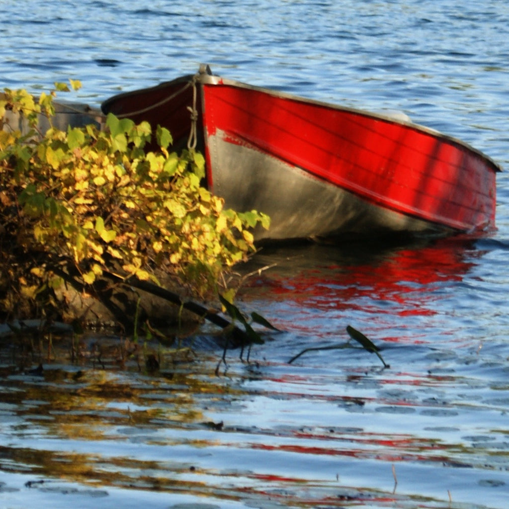 Mini 6"x6", gallery depth acrylic on canvas. Little red aluminum boat tied up at shore, resting on the quiet waters, waiting for its next trip out.