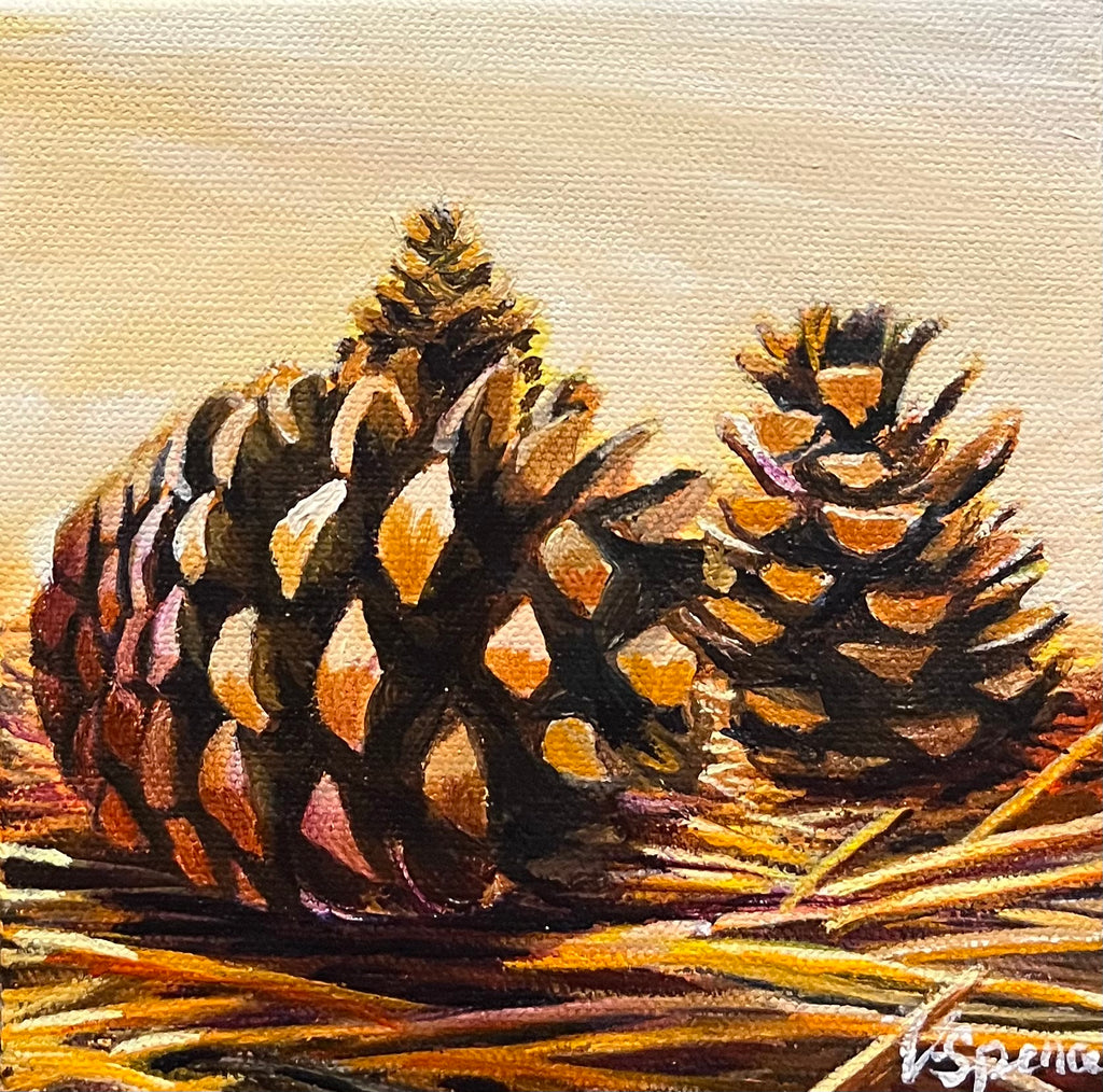 Mini 6"x6", gallery depth acrylic on canvas. Pine Cones nestled in on the forest floor among a bed of pine needles have found the perfect spot to spend the winter as the colder weather descends upon us.