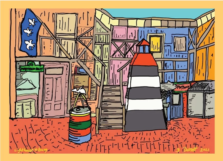 The lighthouse and buoy at Kingston's Martello Alley are clever, artistic disguises for functional items: the lighthouse hides the garbage bins, while the buoy conceals the kitchen's oil drums, creating an illusion of a quaint European street with faux shops for the surrounding art gallery and courtyard, inspired by David Dossett's vision to beautify a forgotten alley.
