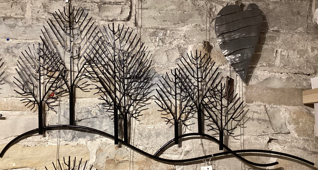 7 trees on a hillside, black finish. Includes 1 magnetic red cardinal. This beautiful piece of 7 trees growing from the hillside would look fabulous on that special wall in your home.