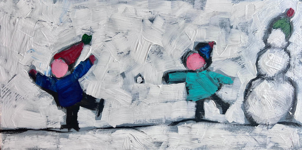 Inspired by some of my favourite childhood memories, I’ve been working on a new painting series featuring children playing that classic schoolyard game we all knew so well: “King of the Castle.” It was a rite of passage—though I’ll admit, I was never very good at it! But it taught me resilience and determination. I also am working on other games, that, in retrospect, were a little rough. The latest is this one where we have kids having a snowball fight.