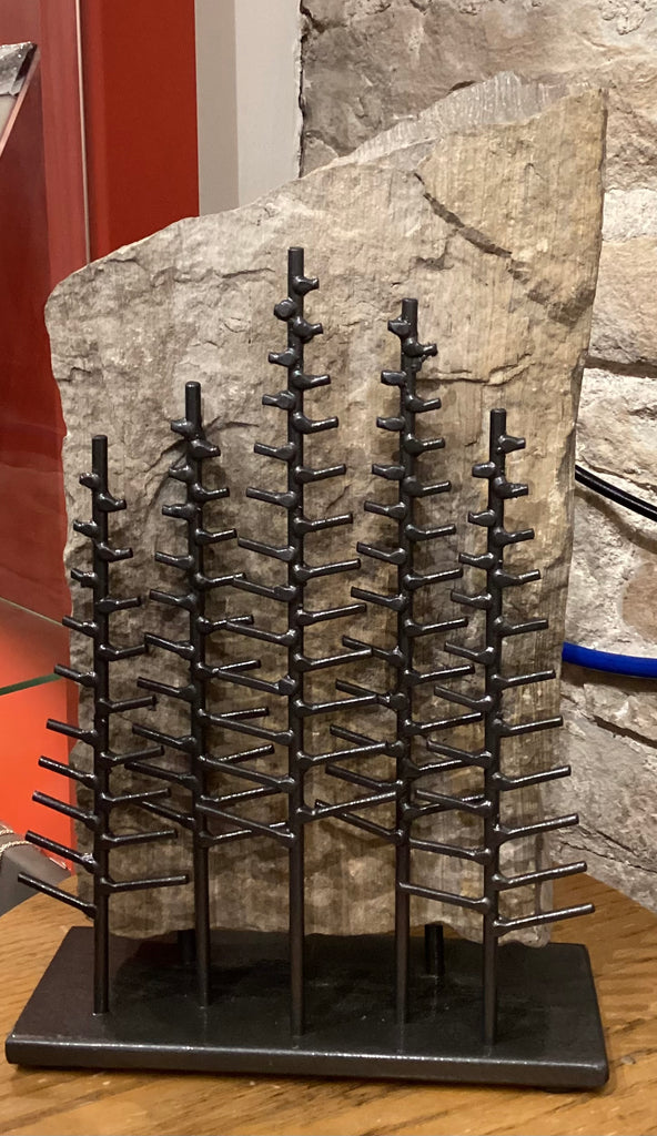 Five trees mounted on at the base of this rock cliff ,  black painted finish. This beautiful rock and tree can go on your deck or in your home. But these trees are solidly anchored to the rock.