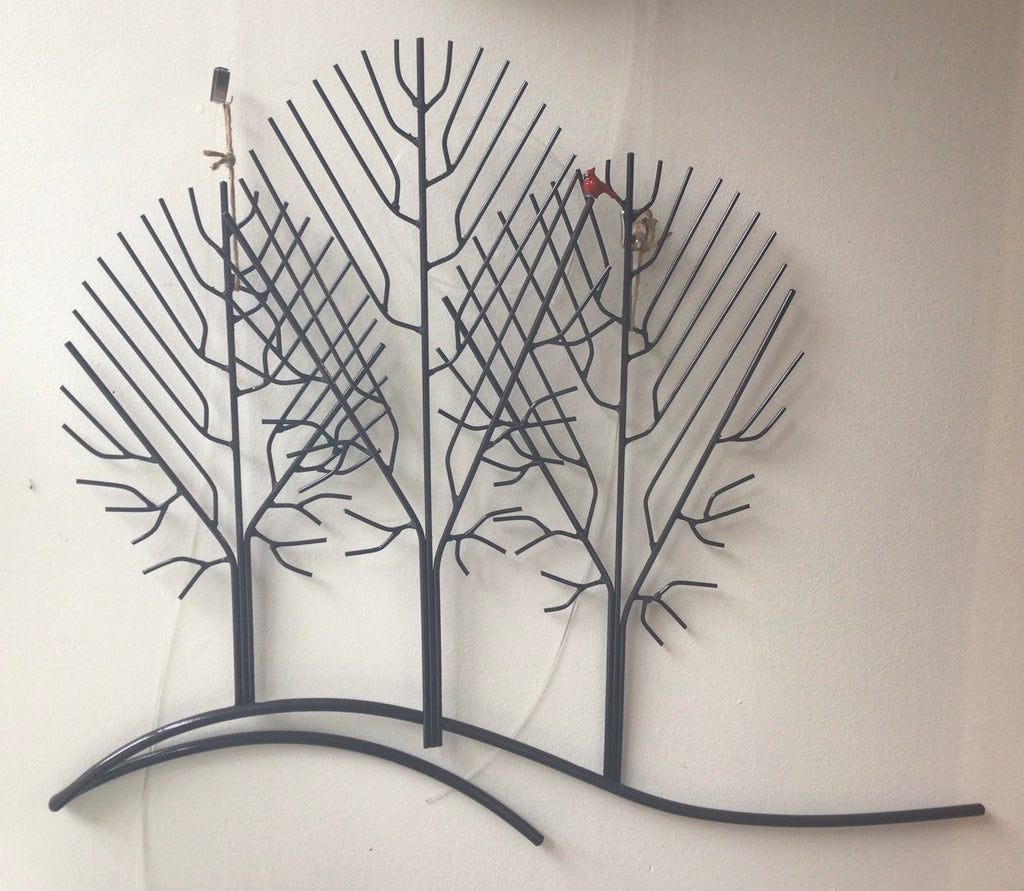 3 trees on a hillside, black hammered finish. Includes 1 magnetic red cardinal. This beautiful piece of 3 trees growing from the hillside would look fabulous on that special wall in your home.