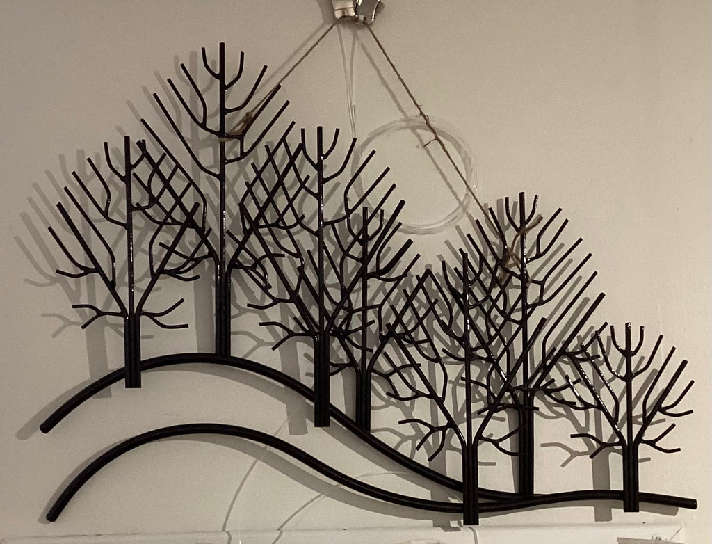 7 trees on a hillside, black hammered finish. Includes 1 magnetic red cardinal. This beautiful piece of 7 trees growing from the hillside would look fabulous on that special wall in your home.