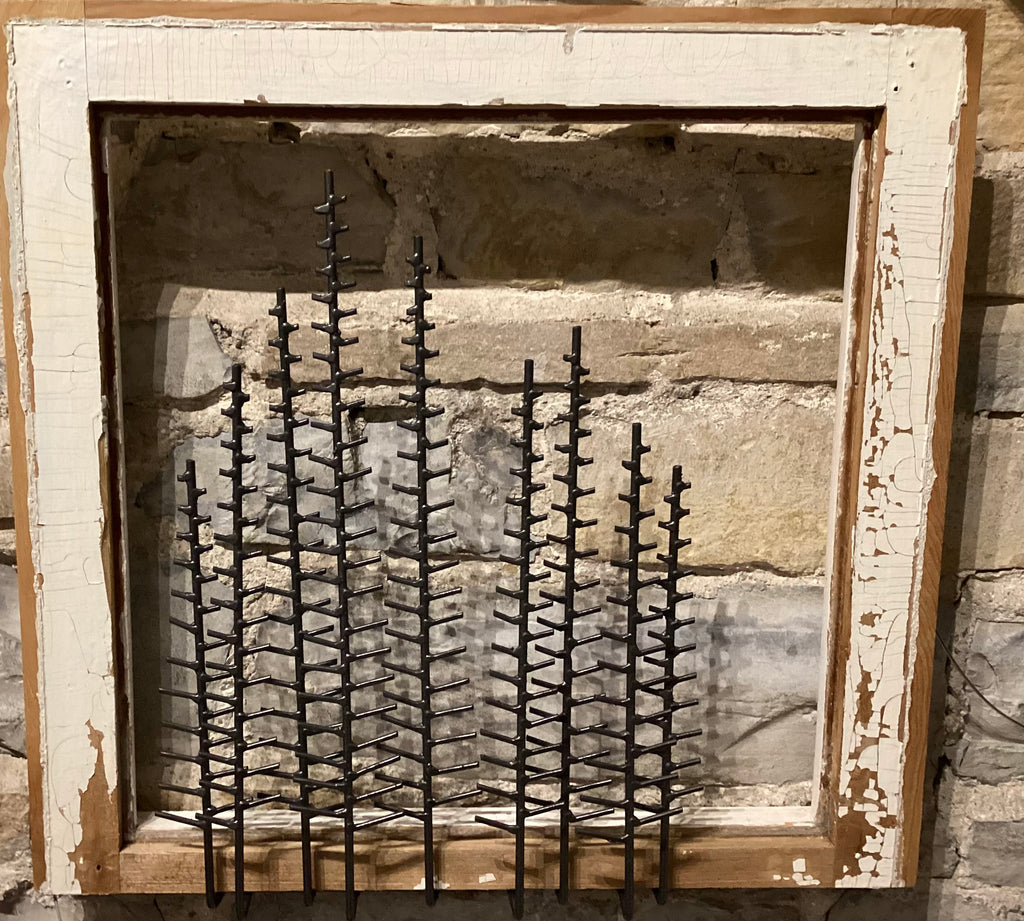 9 trees set in white distressed window frame with glass, metal painted black, includes 1 magnetic red cardinal