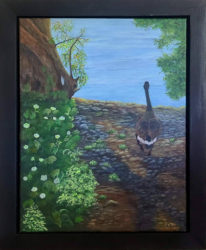 This peaceful painting captures the quiet retreat of a goose walking along a shaded, rocky path toward Lake Ontario. Tall trees frame the scene, their branches reaching gently over the water. The shading of the trees create an "X" on the ground. The soft lighting evokes a sense of solitude and connection to nature.