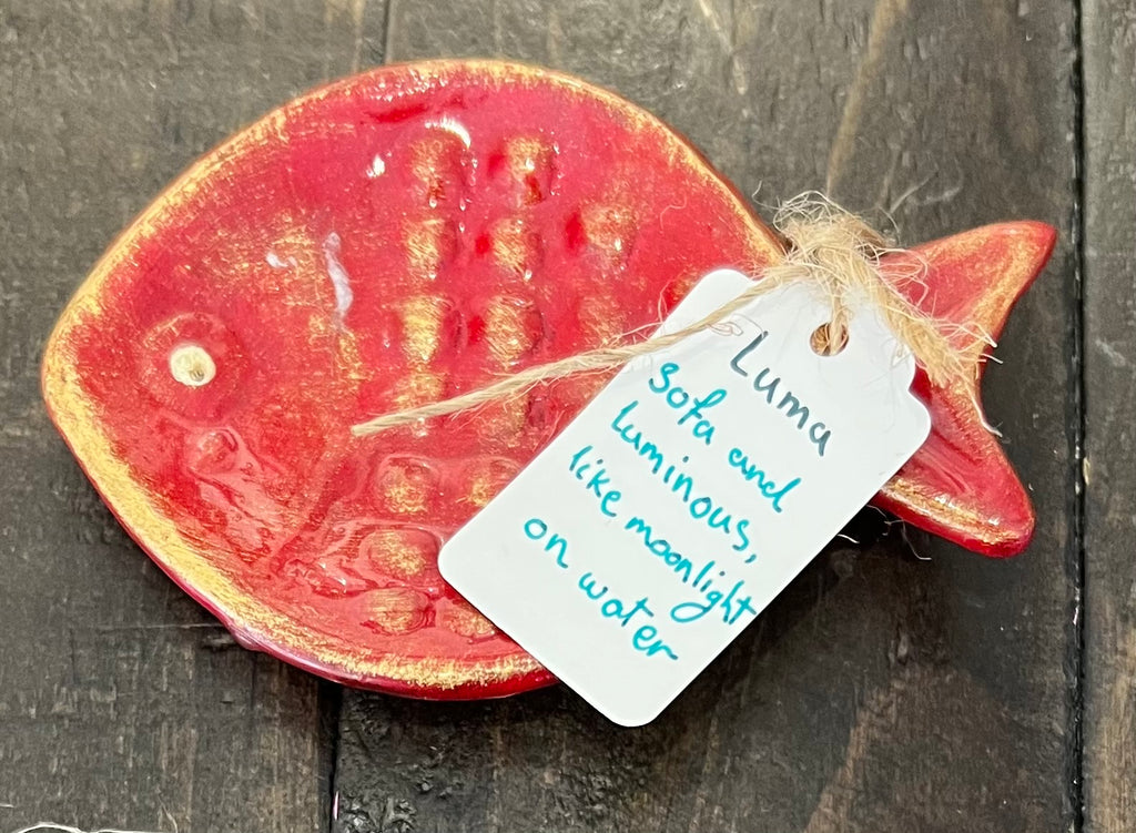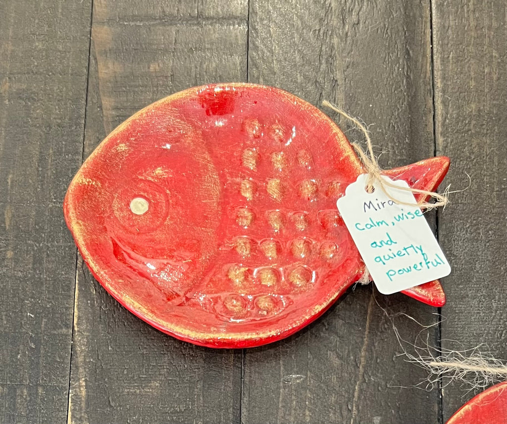 Small pottery pieces in the shape of fish, hand painted in red and gold.